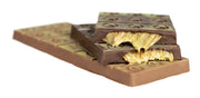 This luxurious ¼lb. bar measures 6 x 2.25 x 1/2" and features premium 34% milk chocolate filled with an authentic Dubai center made from rich pistachio paste and delicately crushed phyllo pastry.